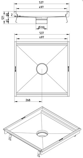 KØKKENBRØND 500x500 - Gulv: beton, fliser og epoxy - Udløb: Ø110mm, lodret - Rustfrit stål: AISI304/EN1.4301
