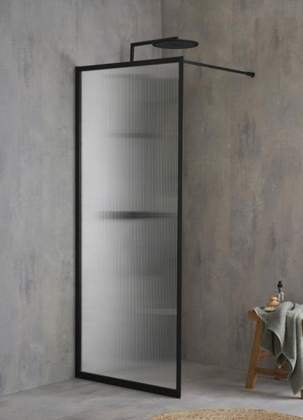 Cassøe fast brusevæg - Mat sort ramme/Riftlet glas - 75 cm Stilren brusevæg med mat sort ramme og riflet glas. Du får her en smuk afgrænsning af dit bruseområde, uden at miste lys. Det riflede, eller rillede, glas giver privatliv, uden at glasset er matteret. Den faste brusevæg er indrammet af sorte profiler, og støttearmen er ligeså sort. Fuldend looket med et brusesystem i mat sort for et minimalistisk badeværelse i New Yorker-stil. Specifikationer: