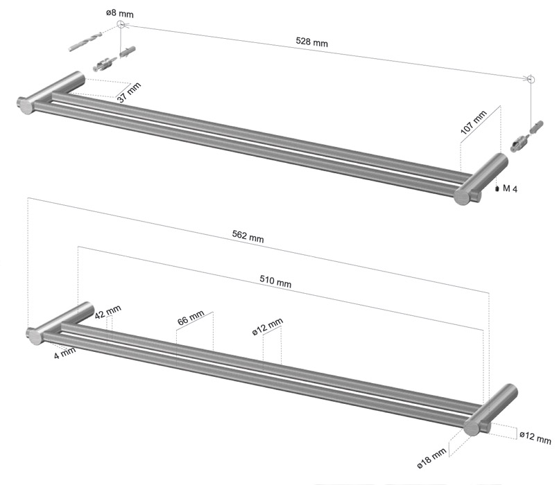Cool Line dobbelt håndklædestang - Matbørstet stål Dobbelt håndklædestang i rustfrit stål fra Cool Line. Monteres med skjulte skruer. Specifikationer: