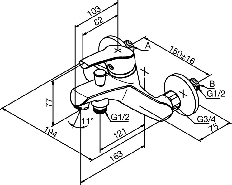Damixa Rowan vægbatteri til kar/brus - Krom.