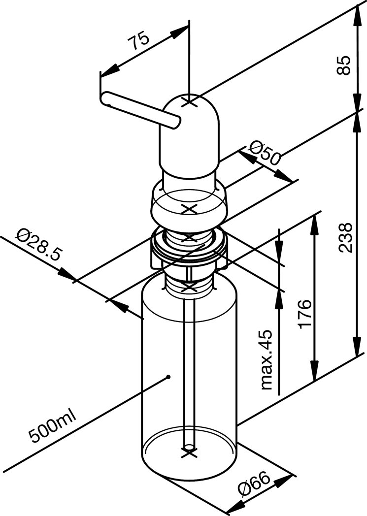Beholderen er på 500 mm. Det svarer mindst til en almindelig bøtte sæbe.