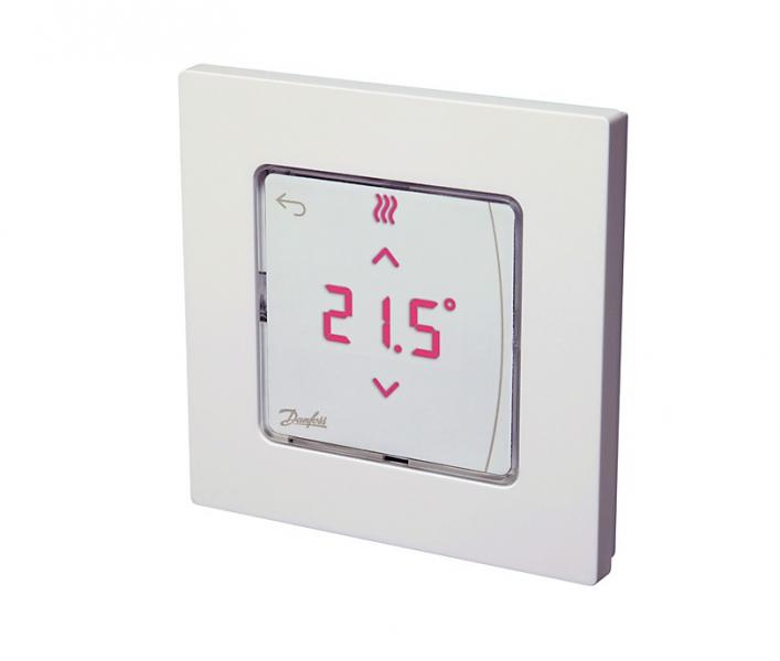 24V rumtermostat 80x80 til indbygning med udskiftelige rammer og touch display. Kan benyttes med gulvføler. Trådført.