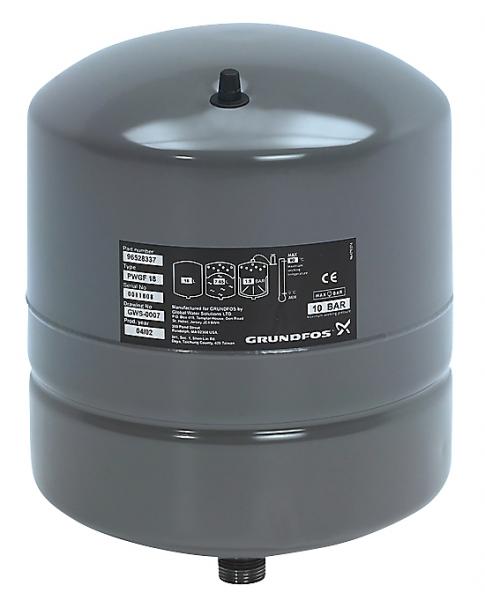Grundfos GT-H membrantank 12ltr. PN10 G 3/4" Beholderen er en letvægtstrykbeholder i kompositmateriale. Membranen er klorbestandig 100 % butylmembran med en præcisionsstøbt copolymer-polypropylen-foring til suveræn luft- og vandadskilelse. Beholderen har en FlowThru-forbindelse, der konstant skyller beholderen, mens pumpen kører. Det sikrer, at vandet i beholderen forbliver frisk og eliminerer risikoen for stillestående vand ved normal drift af anlægget. GT-H-12 PN10 G 3/4 VBeholderen er en ståltrykbeholder med en ikke-udskiftelig gummimembran til varmeapplikationer. Beholderne har en ikke-udskiftelig membran, som på forhånd er fyldt med nitrogen (1,5 bar). Beholderne er forsynet med en ikke-giftig membran i butylgummi, som opdeler beholderkammeret i to rum. Det øverste rum indeholder komprimeret nitrogen. Det nederste rum har en foring af polypropylen (PP) og er fyldt med vand fra pumpen. En trykbeholder styrer vandforsyningens tryk og begrænser derved pumpens skiftefrekvens i tilfælde af lavt vandforbrug eller lækagetab. Det medfører større komfort i installationen ved at begrænse pumpens start/stop-frekvens, og det øger systemkomforten ved at kompensere for trykfald, når der åbnes for en hane, og reducere problemer med vandslag i rørene. Medie: