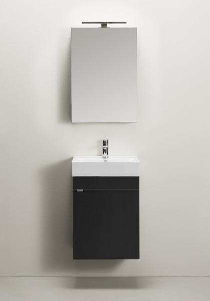 Håndvaskskab med soft close, samt håndvask og spejlskab.