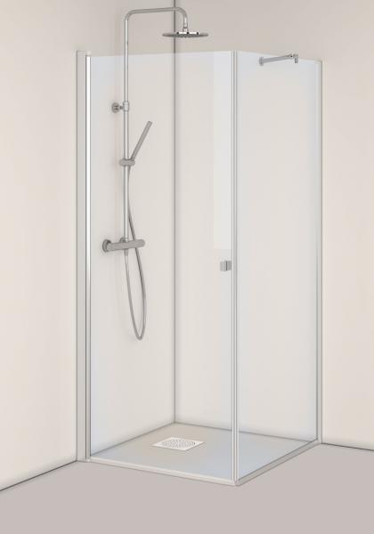 En fast brusevæg og en svingbar dør monteret i hjørne eller i nische.