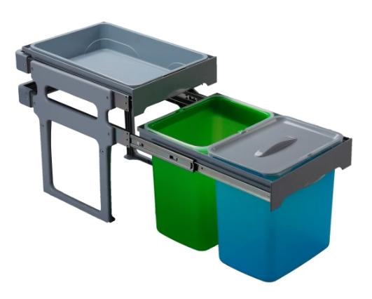 TANK40 med 2 store affaldsbeholdere, beregnet til montering i køkkenskab. Ovenpå spandene er en smart udtræksbakke, som kan bruges til opbevaring af eksempelvis affaldsposer eller rengøringsmidler. Specifikationer: