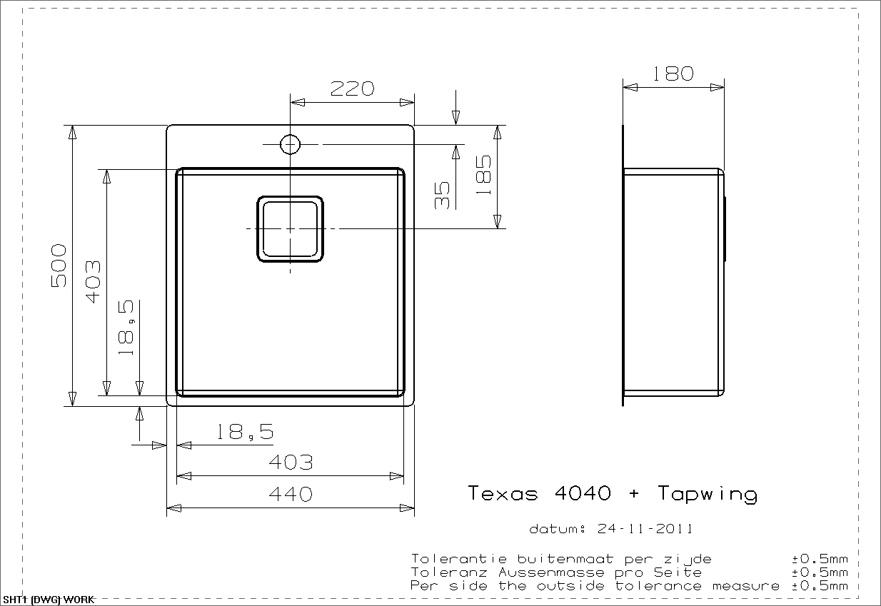 De indvendige runde hjørner (R: 10 mm.) følger vaskens yderkant, hvilket giver et harmonisk design, ligeledes er de indvendige runde hjørner rengøringsvenlige.