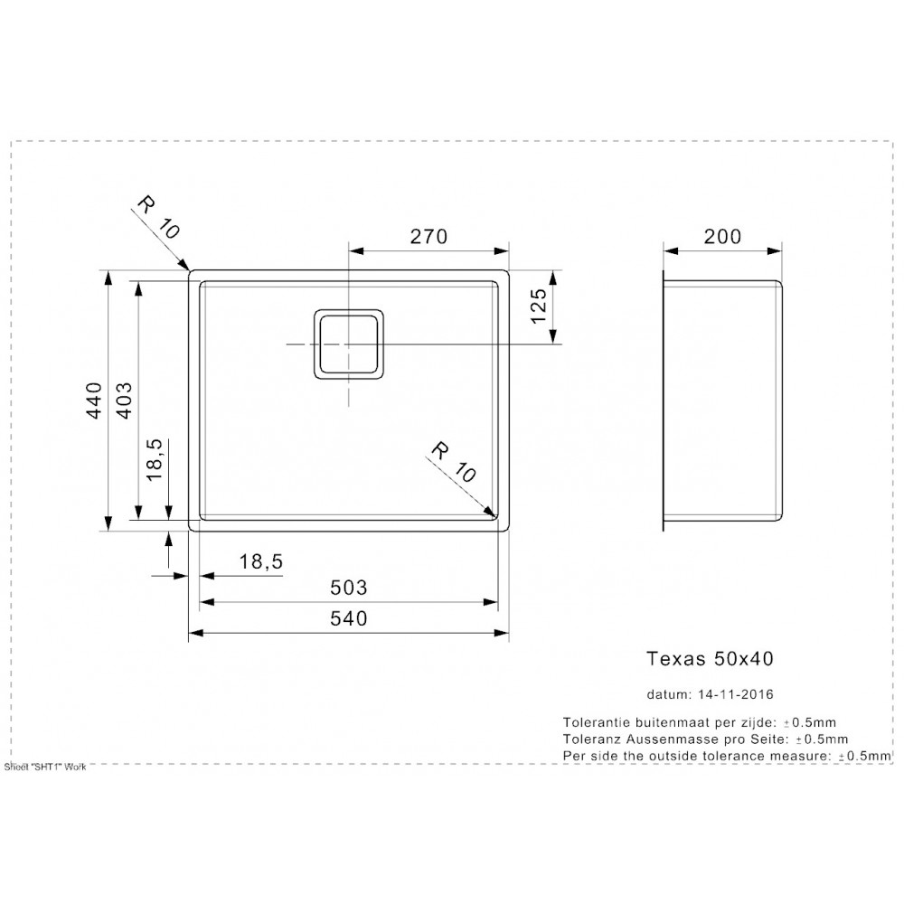 Rustfri stålvask, uden hanehul, i moderne firkantet design med kvadratisk afløb.