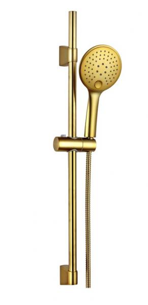 Nortiq Edgewater brusesæt - Børstet messing Det børstede messing Nortiq Edgewater-sæt indeholder brusehoved, bruseslange og vægstang. De tre dele udgør tilsammen en elegant tilføjelse til det moderne badeværelse. Sættets premium håndbruser er selvrensede, har anti-kalk system og er udstyret med 3 brusefunktioner. De nyudviklede silikonedyser renser sig selv, og trykket fra vandet får dysserne til at ekspandere, hvilket effektivt forhindrer kalkdannelse. Desuden sikrer de elastiske dyser en blød stråle og en behagelig badoplevelse. Med dette sæt kan håndbruseren bruges håndholdt eller placeres på vægstangen. På vægstangen kan håndbruseren både tiltes samt justeres op og ned, således at bruseren altid er placeret i den ønskede højde og vinkel. Bruseslangen er udstyret med en anti-twist funktion, der gør det ukompliceret at anvende håndbruseren, da slangen ikke snor sig.
