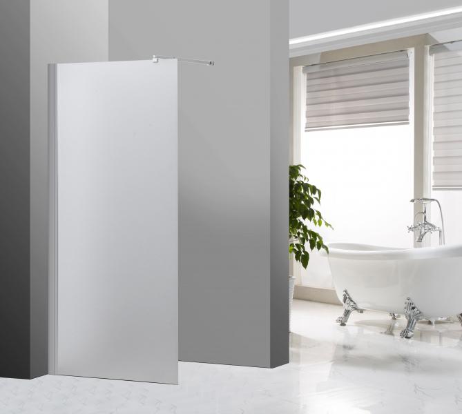 Brusevæggen leveres i frostet sikkerhedsglas med en tykkelse på 5 mm, og den sikres til væggen ved hjælp af vægprofilen i forkromet aluminium.