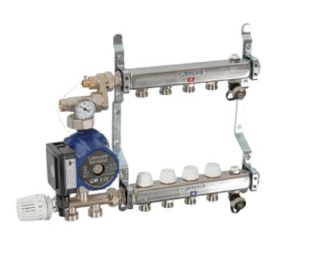 Gulvvarmeunit bestående af manifold og shunt samlet i en enhed med 2 kraftige vægbeslag. 3/4" tilslutning for varme frem og retur samt 1/2" x 3/4" nippel tilslutning til pex. Udluftnings skrue og aftapningsventil på både frem og retur. 20mm omløber medfølger. Billede viser med manifold til 4 kredse |