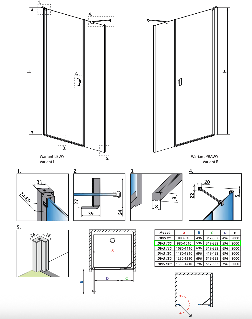 Strømberg Noma 45 svingdør m/sidepanel 1000mm - Højre - Poleret messing Brusenichedør med fast sidepanel - begge med paneler og greb på døren i poleret messing PVD. Specifikationer: