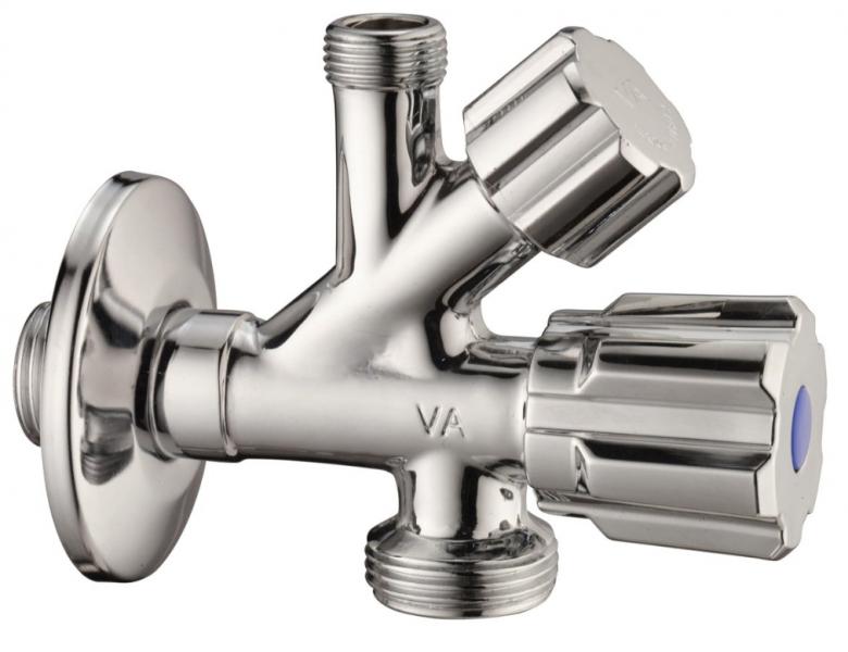 Kombistopventil i krom. Anvendes ved vandtilslutning til armaturer, hvor der skal tilkobles vaske- og opvaskemaskine. Inklusiv roset. Husk pakgarn og paksalve ved montering i væg.
