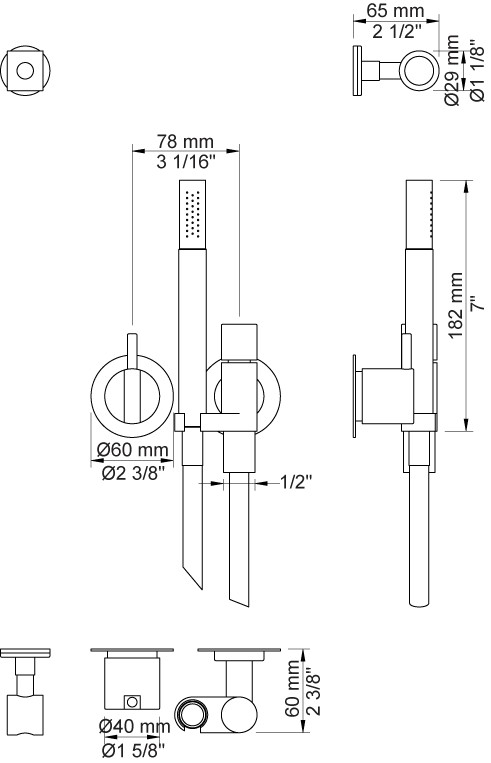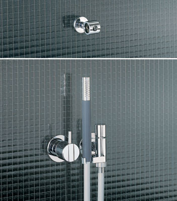 Et-grebsblander med keramisk ventilenhed 100, håndbruser og holder med kontraventil 070, 1 stk. 60 mm dækrosetter 001, 1 stk. 60 mm dækroset 3001, håndbruserholder T9.