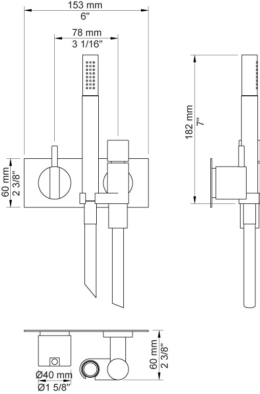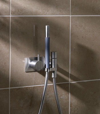 Vola 172 Bruserbatteri uden termostat - Krom. Vola 172 Bruserbatteri med håndbruser og dækplade.
