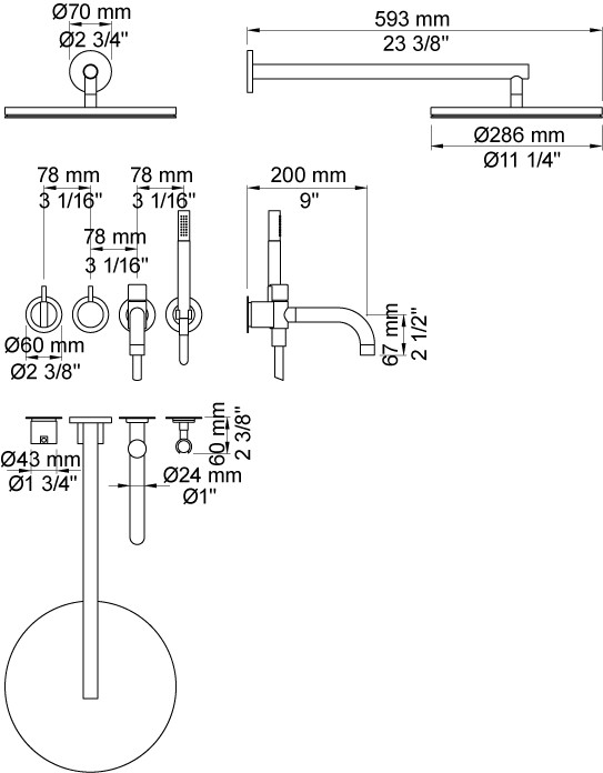 Vola 2441DT8-061 komplet armatur til kar med tud, hovedbruser og håndbruser