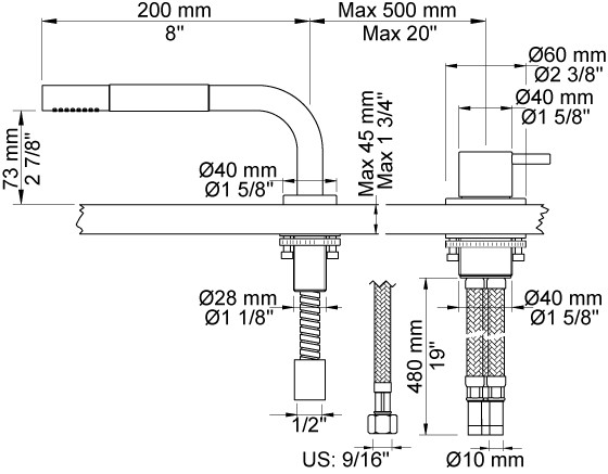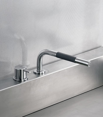 Vola 500T1-00 håndvaskbatteri med keramisk ventilenhed, 360° dobbelt svingbar tud med vandbesparende luftindblander med et-grebsblander og håndbruser T1.