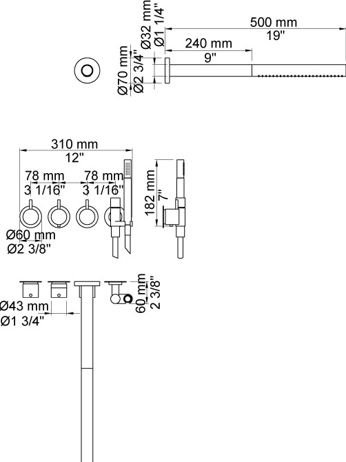 Vola Indbygningstermostat ¾'' med omskifter T2 håndbruser med metalslange og holder til højre hovedbruser Separat udløb Rosetter Krom 16 3/4''RG/PEX |