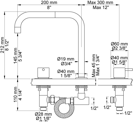 Vola To-grebsblander bestående af 2 stk keramiske stopventiler Dobbelt svingbar udløb, 200 mm, ø19 mm Standard 25 mm Rosetter Krom 16 ½''RG