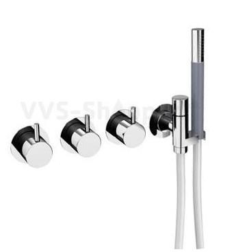 Vola To-grebsblander for stor vandmængde, med to løse afgangsmuffer T2 håndbruser med metalslange og holder til højre Separat udløb Krom 16 ½''RG/PEX