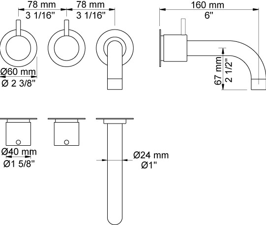 Vola To-grebsblander med keramiske ventiler, Standard 25 mm Fast udløb, 160 mm, ø24 mm Standard 25 mm Rosetter Krom 16 ½''RG/PEX